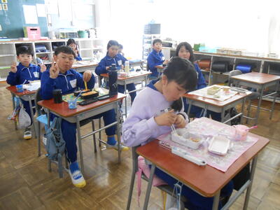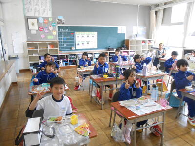 1年生は、交通安全レターをおうちの人に書いていました。久々の登校でしたが、いつもよりちょっとおとなしく感じました。2年生は、国語の授業で、話すこと・聞くことの学習でした。町探検に行った場所で質問した内容や心に残ったことを一人一人発表していました。