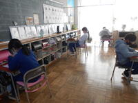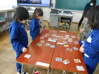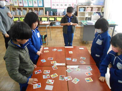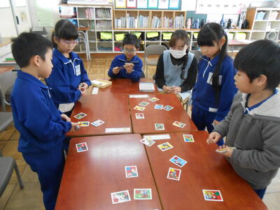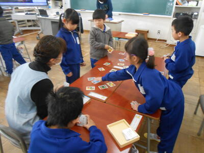 1年生は、生活科で、グループごとにかるた遊びを行っていました。読み手の担当者も決めて、真剣に楽しんでいました。