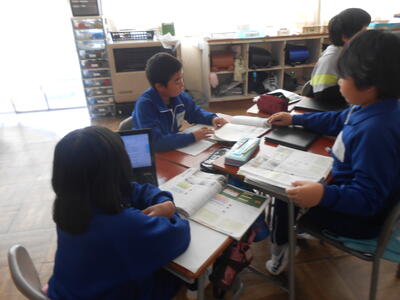 5年生は、社会科で、これからの工業生産についての学習でした。これまで、自分で課題を決めて調べ学習わしまとめてきました。その振り返りを話し合っていました。