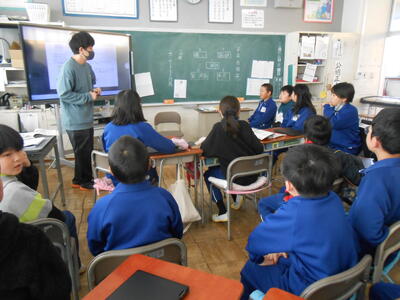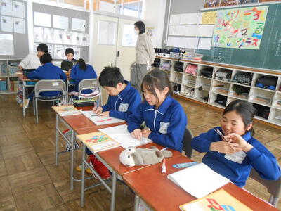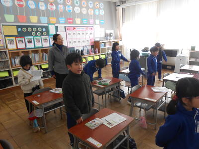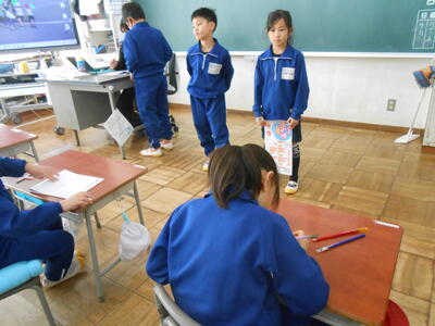 1年生は、音楽の授業でした。6年生へ送るための歌を決めていました。候補の「世界に一つだけの花」の歌詞のどんなところがよかったか伝えていました。2年生は、外国語活動の時間でした。英語の体の名前を、歌やチャンツ、体を使って身に付けるよう活動していました。