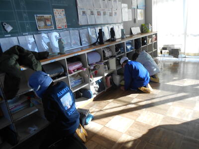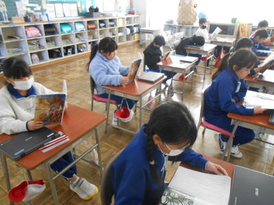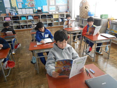 1年生は、冬休みに借りた本を図書室に返していました。2年生は、冬休みに学習してきたかけ算九九や漢字の確認をしていました。