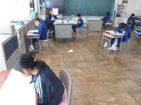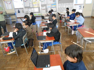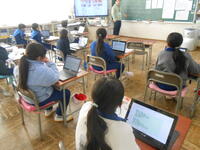 5年生は、家庭科の学習でエプロンの製作をしていました。しつけをして、ミシンで本縫いをしていきます。丁寧に取り組んでいました。6年生は、外国語の学習で、ゲーム形式のソフトを使って英単語のスペルの確認をしていました。2択でしたが、確実にそしてスピーディーに解答していました。