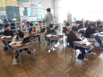 1年生は、音楽の授業でした。歌を歌ったり、鍵盤ハーモニカで「ひのまる」や「きらきらぼし」を演奏したりしていました。とても上手に演奏していました。2年生は校内学力調査に向けて、復習をしていました。2学期までにならった漢字ドリルやタブレットを使って確認をしていました。
