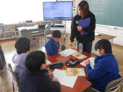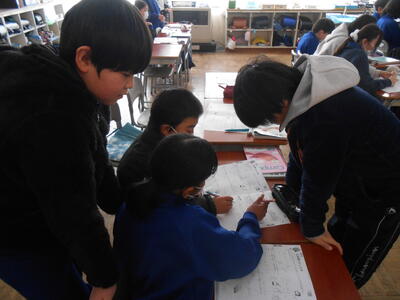 1年生は、算数でじんちとりのゲームをしていました。友達とじゃんけんをして、勝ったら一ますずつ色を塗っていきす。とっても盛り上がっていました。2年生は、お楽しみ会の練習をしていました。手品、歌、ダンス、漫才など出し物ごとに分かれて協力して行っていました。