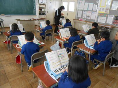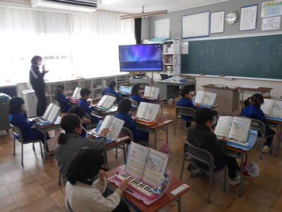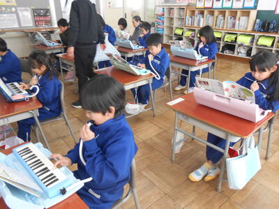 1年生は、音楽の授業でした。鍵盤ハーモニカで「きらきらぼし」を、指使いやタンギングに気を付けて演奏していました。一人一人発表も行っていました。