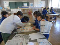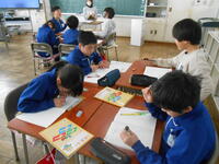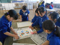 2年生は、紙版画の印刷をしていました。慎重に紙を水で濡らし、ばれんで色を写し取ります。鮮やかな色で仕上がりました。