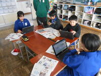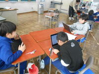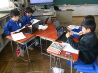 3年生は、社会科の授業でした。工場のしごとについて調べたことを、グループごとにまとめ、発表する準備をしていました。4年生は、図工で学校のいろいろな場所で、タブレットで写真を撮って作品づくりをしていました。絨毯を接近して撮影し砂漠の風景に見立てたり、楽器を工場の建物に見立てたり、子供ならではの発想で取り組んでいました。