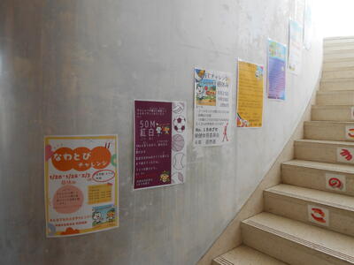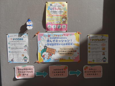 市立図書館とのコラボ企画、「読んでミッション」が広場に案内されたり、保健体育委員会が作成した体力つくりのポスターが廊下に掲示されています。