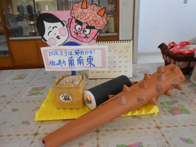 さいこうクラブさんが作成した節分のグッズです。今年の恵方は「南南東」だそうです。うさぎのシュガーも元気です。