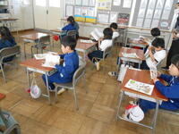 2年生に司書による読み聞かせを行いました。「つばきレストラン」「いかあげたこあげ」という2冊の本でした。司書の問いかけに、素直に反応しながら聞いていました。