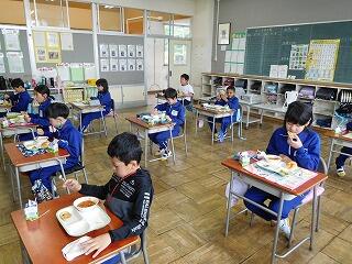 1年生は初めての給食です。「おいしい」と言って食べていました。2年生は準備が早くできていました。