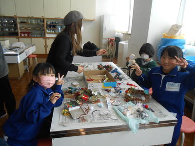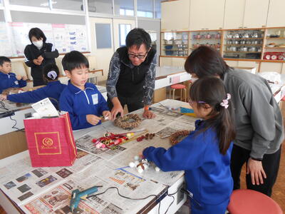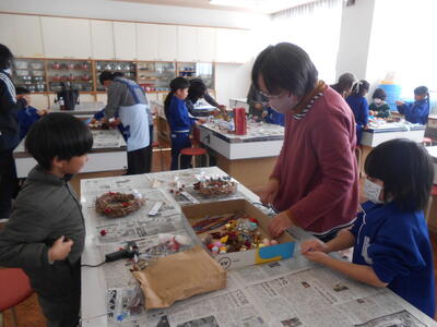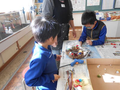 今日は、延期になっていた家庭教育学級で、クリスマスリースづくりを行いました。グルーガンでつける難しさもありましたが、慎重に丁寧に取り組んでいました。さいこうクラブの方々にもお手伝いをいただきました。自分で育てたアサガオのリースが素敵に出来上がりました。