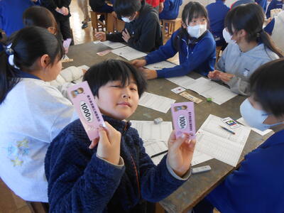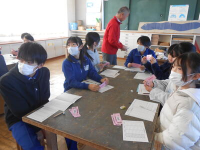 今日は、県金融広報委員会から来ていただき、金融経済教育の話をしていただきました。ゲームをしながらお金の流れなどを知ることができました。