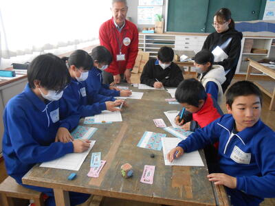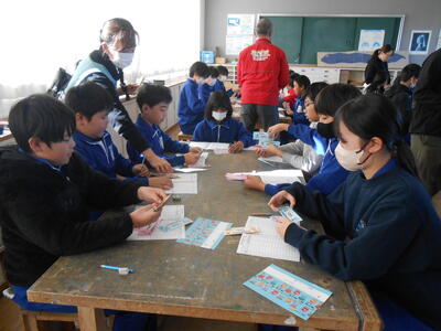 5年生は、図工の授業でした。「笑顔がうまれるしかけ」という題材で、自分のアイデアを生かし、みんなが笑顔になれるような工夫をした作品づくりに取り組んでいました。6年生は、国語の物語「海のいのち」のまとめで、印象に残った場面をカードに書く活動でした。