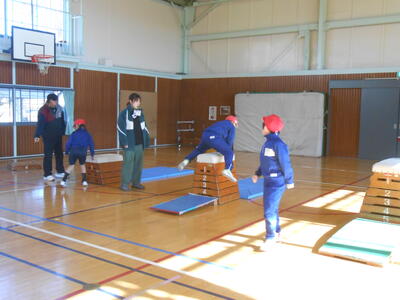 体育の授業でした。跳び箱運動につながるいろいろな動きのある活動に挑戦していました。手で体重を支える感覚やロイター版を使ったジャンプの感覚、舞台からマットに前転しながら落ちる感覚などを、自分のめあてを考えながら取り組んでいました。