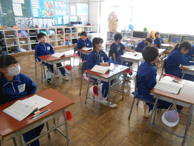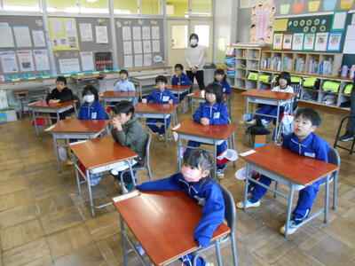 1年生は、交通安全レターをおうちの人に書いていました。久々の登校でしたが、いつもよりちょっとおとなしく感じました。2年生は、国語の授業で、話すこと・聞くことの学習でした。町探検に行った場所で質問した内容や心に残ったことを一人一人発表していました。