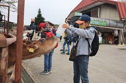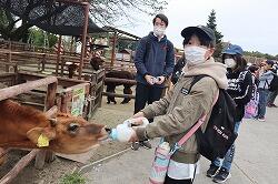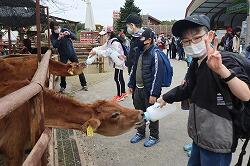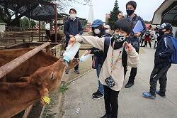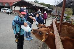 乗り物なども楽しみましたが、動物とのふれあいで子牛へのミルクあげの体験をしました。