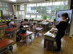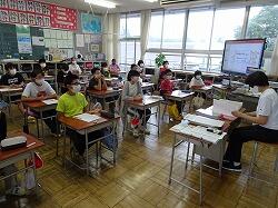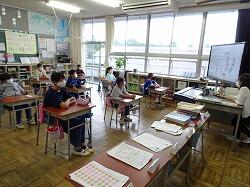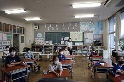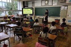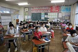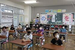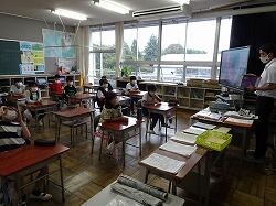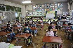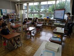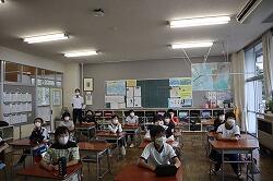 校歌はなしで、始業式を終えました。少し時間が余ったので、各学級でコロナ感染症対策のパワーポイント資料を見ながらコロナ対策を確認したり、宿題の確認をしたり、係を決めたりしていました。