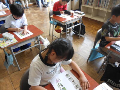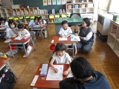 1年生も2年生も国語の授業でした。1年生は、自分がしたことを作文に書いていました。「つぎに、はじめに、それから」など、順序をあらわす言葉を使って書いていました。2年生は、漢字の学習でした。分からない字は、教科書の巻末の一覧で調べて書いていました。