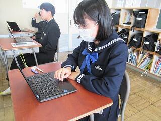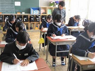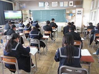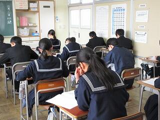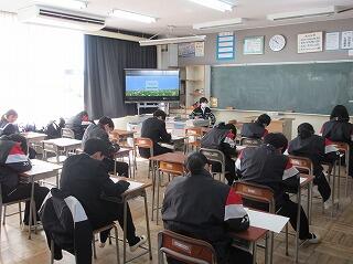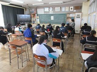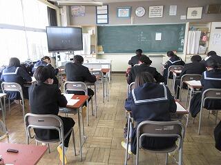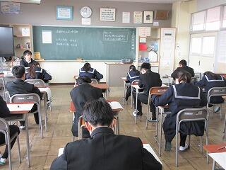 1年生と2年生が学年末テストを受けています。普段の授業で学んだことや家庭で学習(復習)したことが、しっかりと身に付いているのか確認するのが定期テストです。テストの終了時刻まで懸命に考えて、解答を出すことに集中しています。