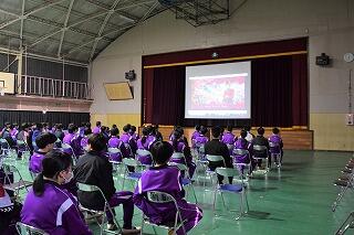 次年度の生徒会役員が企画・運営する「3年生送る会」を実施しました。県立高校の受検や卒業を目前に控えた3年生に感謝の気持ちを伝えるとともに、緊張した日々のひとときをリラックスしてもらいました。3年生からのリクエストによる映画鑑賞と、3年間を写真スライドで振り返り、会場は懐かしさと笑顔につつまれました。