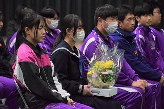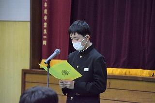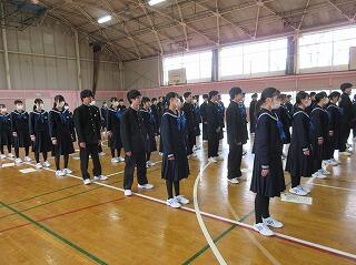 卒業式を直前に控え、同窓会入会式を行いました。今年度の入会生は56名で、1947年の開校から合計11,958名となります。代表生徒による入会のことばの後、同窓会長様より優良生徒表彰をいただきました。学年理事さんを中心に「みんなで母校の山前中学校を支えよう」という思いをもって、後輩たちにエールを送り続けてほしいと思います。