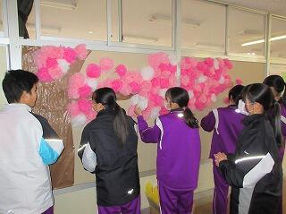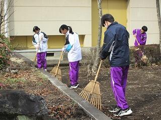 感謝の気持ちを込めた卒業式の会場準備。式場周辺は1年生が担当です。たくさんの思いが込められた式典になることでしょう。