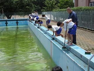 雨雲のすき間をぬって、プール清掃を行いました。屋外で何ヶ月も雨風にさらされているため、落ち葉や埃が溜まっていますが、協力しながら全校生徒できれいにしていきます。気温の上昇とともに恋しくなる冷たい水しぶき。生徒たちの楽しそうな表情が、早くも目に浮かびます。
