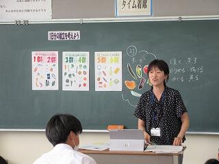 1年生の家庭科で、1日分の献立を考える授業を行いました。6つの食品群から、栄養のバランスや彩り、調理にかかる費用などを予想しながら、食事のメニューを考えています。真岡市給食センターの栄養士さんにアドバイスをいただき、色々と工夫していました。学校給食の献立表も参考になりますね。