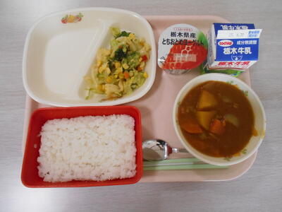 今日の給食は、バターチキンカレー、ナン、マカロニサラダ、いちごゼリーでした。
