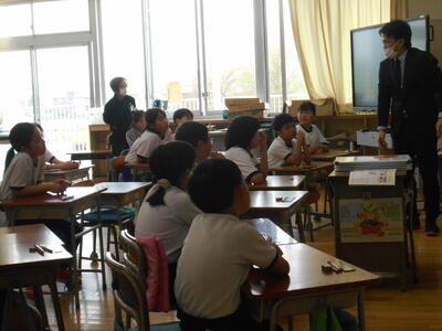 今日は1年生の算数と4年1組の外国語の授業にお邪魔しました。