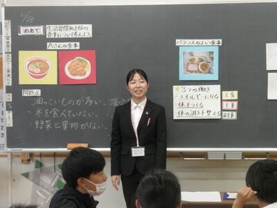 まずは、先週来校していた教育実習生の食育の授業の様子です。
