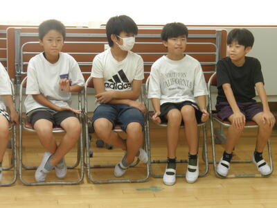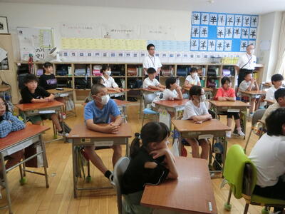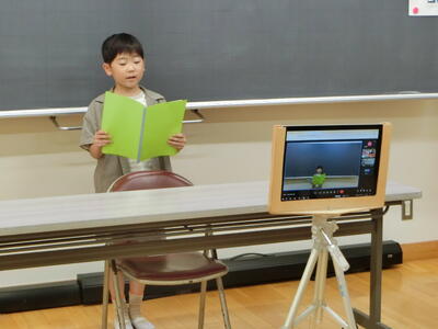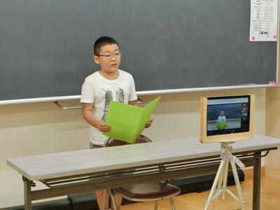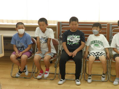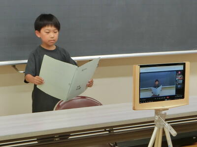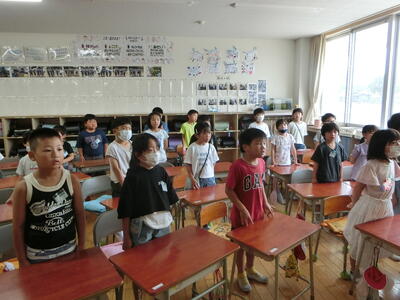 終業式の校長の話では、1学期の学習や生活の様子、学校行事の写真などを見ながら、「やり・ぼう・いも」について振り返りました。