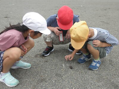かわいい1年生たちは、『せみ、生きてる?』『動いてるよ・・・』の会話中です。