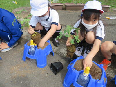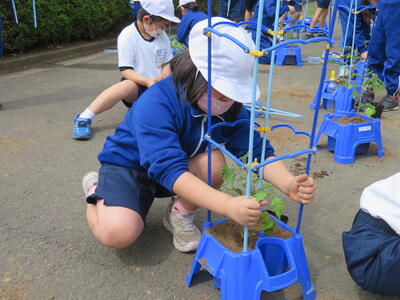 まずは全員でミニトマトの苗植えです。自分の鉢に植えて支柱を立て、水やりをしました。
