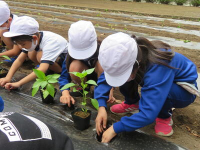 その後に、ナス、ピーマン、ししとう、枝豆、オクラの中からそれそれが選んだ野菜を植えました。