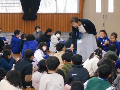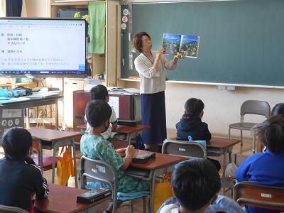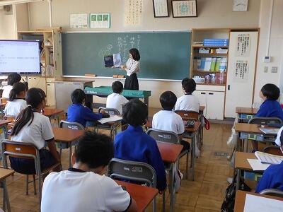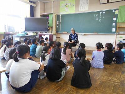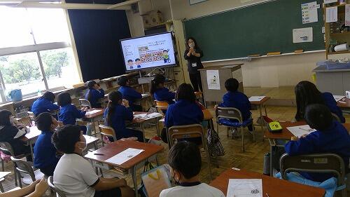 真岡市と姉妹都市を結んでいるアメリカ、グレンドーラ市から、インターンシップ実習生ハンナ・マジディさんが本校に来てくださいました。5年2組で、とっても楽しい授業を行ってくれました。中央がハンナさんです。