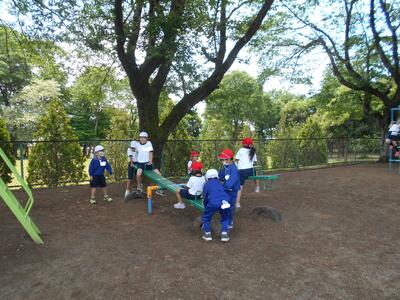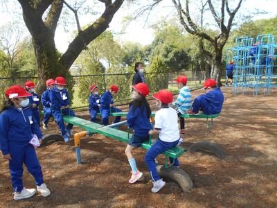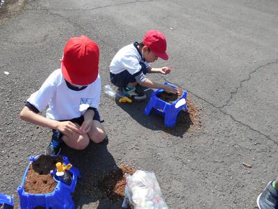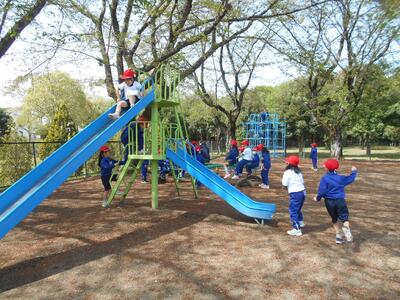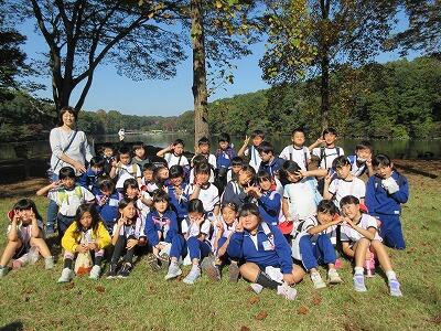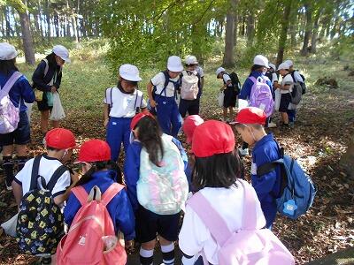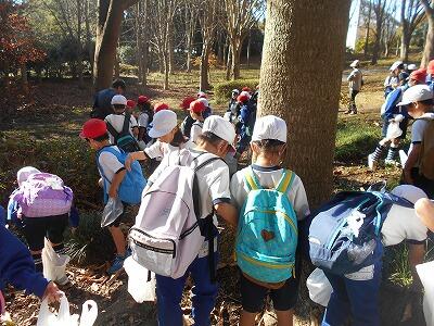 落ち葉や木の実を拾いました。どんぐりや松ぼっくりに大興奮の子どもたちでした。