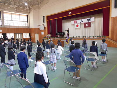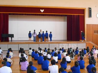 校長先生の話、6年生児童の伴奏で校歌斉唱がありました。