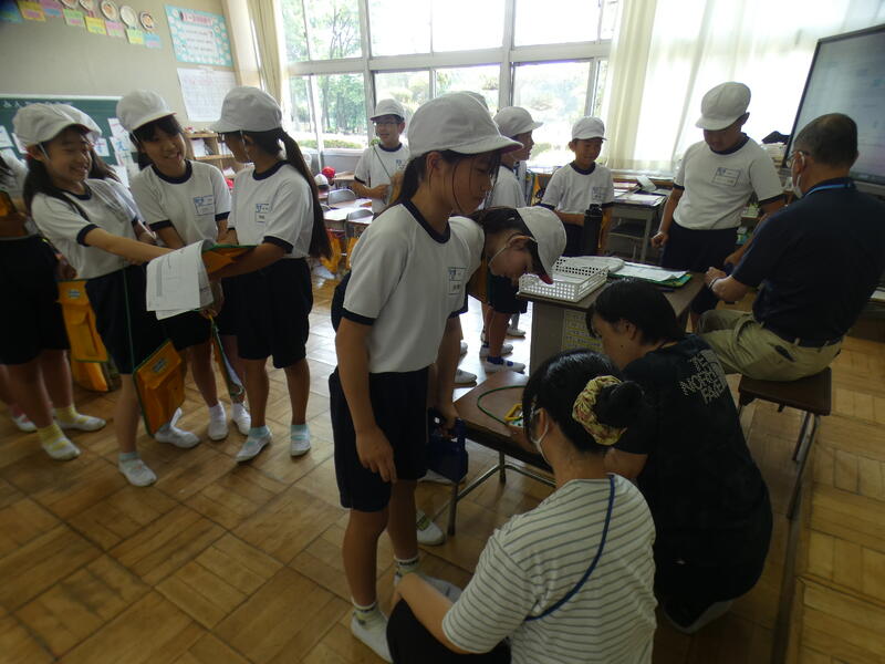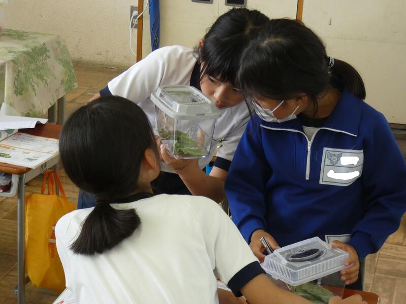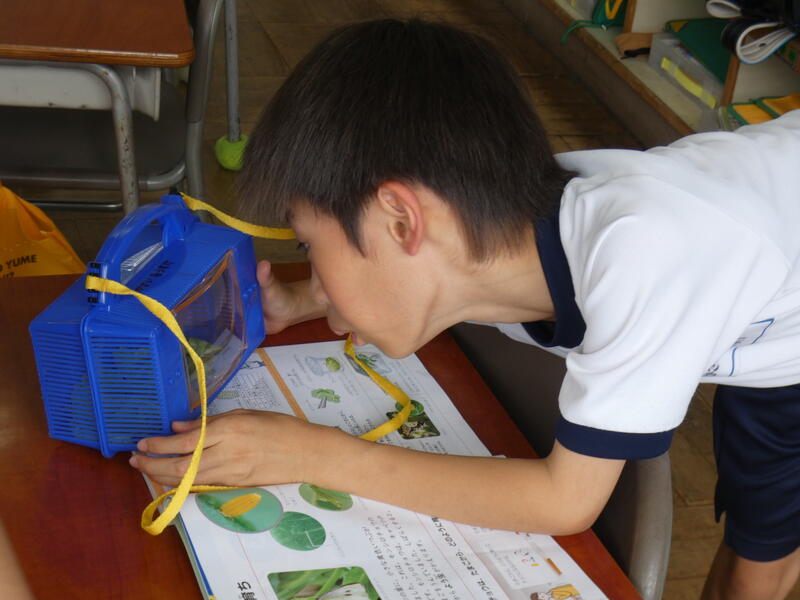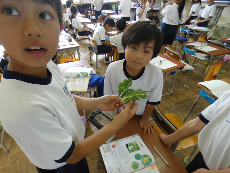 キャベツの葉っぱについている小さな卵を、子供たちはじっくりと観察しています。