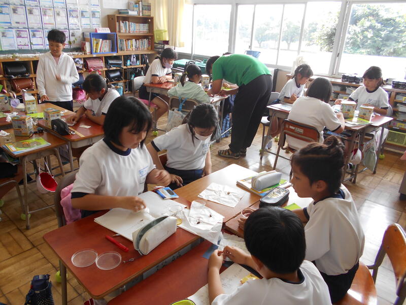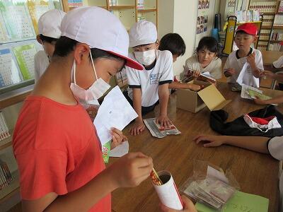 5年生の教室です。理科でインゲン豆の観察を行うために、「インゲンの家」を作成しました。