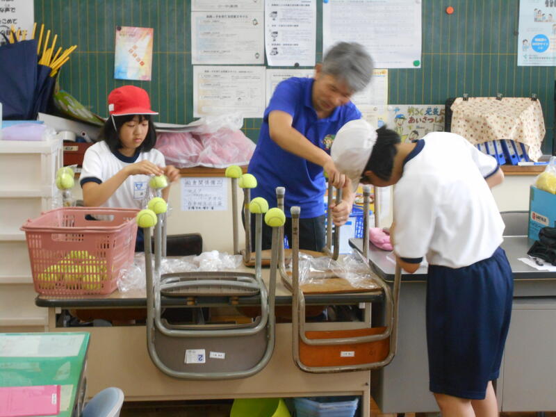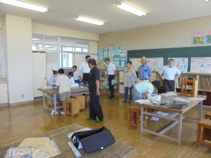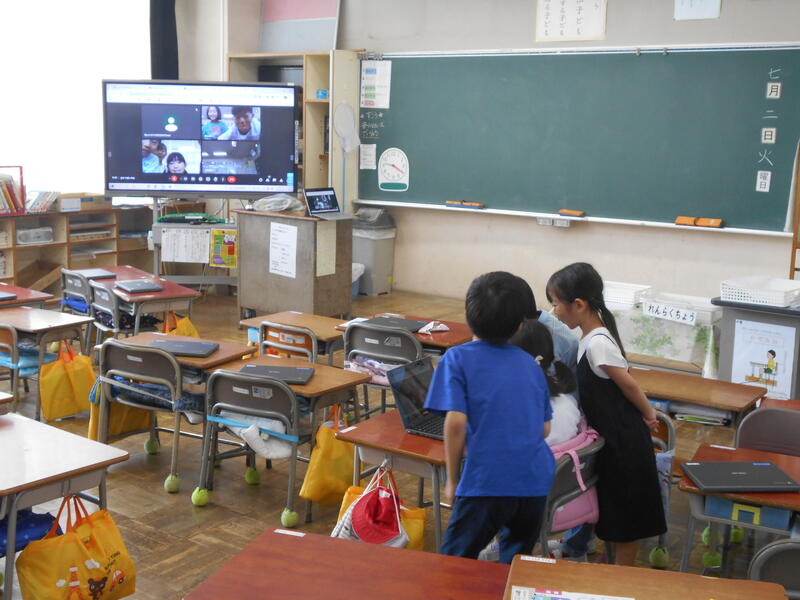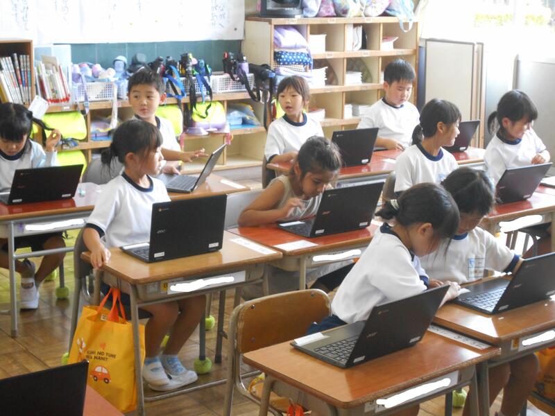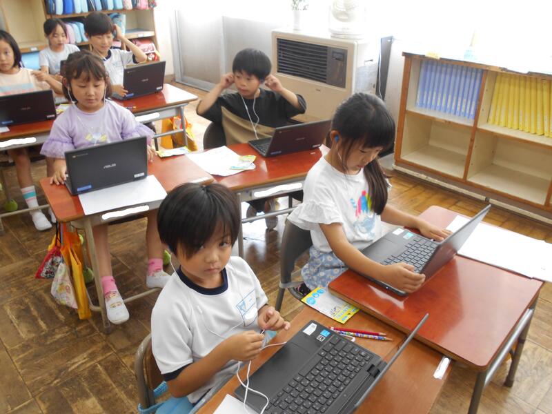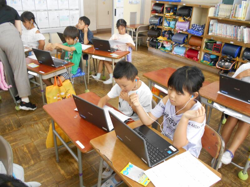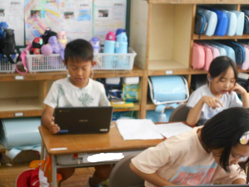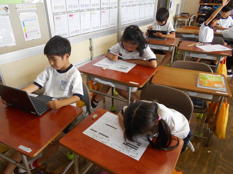 1年生は鉛筆でプリントを使って、4年生はタブレットを使っての学習です。