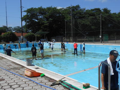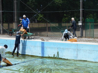 プール清掃では、保護者の皆様と6年生の協力のもと、汚れをしっかり落としてあっという間にきれいなプールになりました。大変お世話になりました。