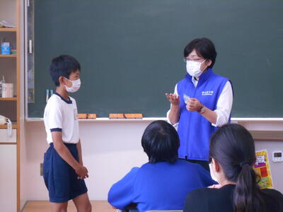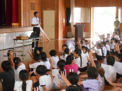 校長先生の講話では、クイズを交えたこれからの亀山小の「あいさつ」について話がありました。