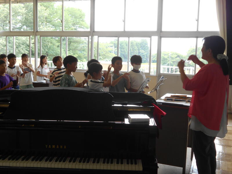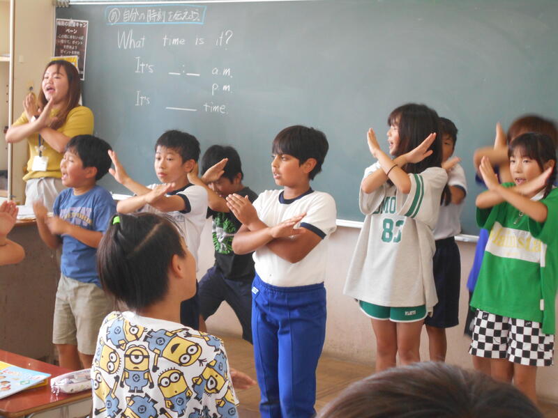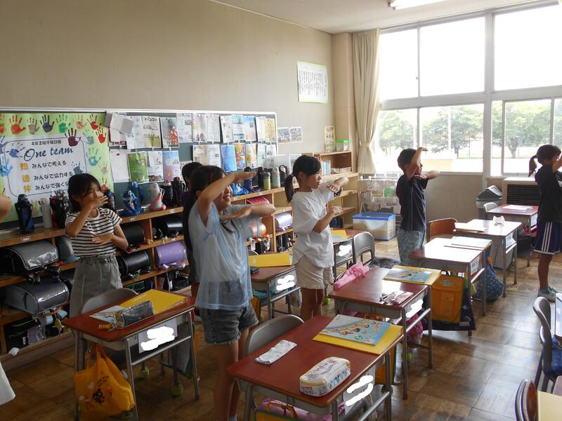 今日は音楽に合わせて体全体を使って発音の練習をしました。