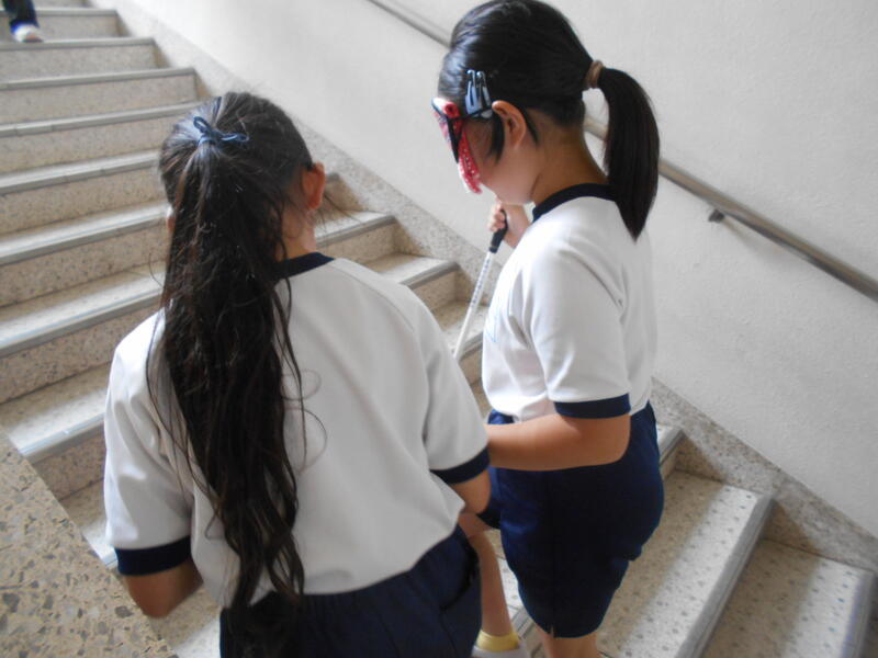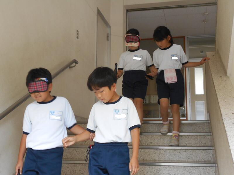 しかし、時間がたつにつれて補助者は「あともう少しで階段終わるよ」「前に人がいるよ」等のアドバイスの仕方が分かり、アイマスクをしてる子は、白杖の使い方のコツをつかみ始めました。