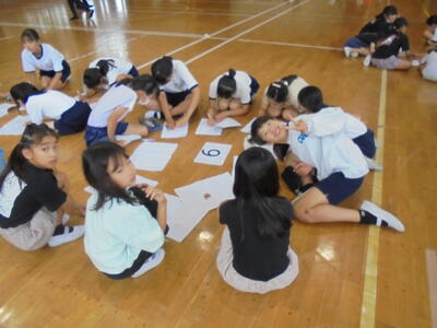 異学年グループで話し合いながら答えを考え、グループみんなでマルエリアかバツエリアに移動します。