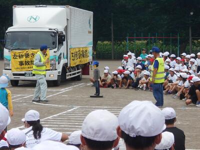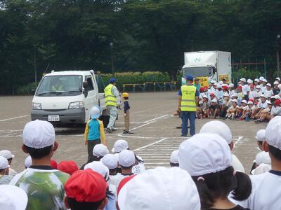 交通指導員の方、長田交番の方、トラック協会の方々のご協力のもと、道路の歩き方や渡り方について学びました。