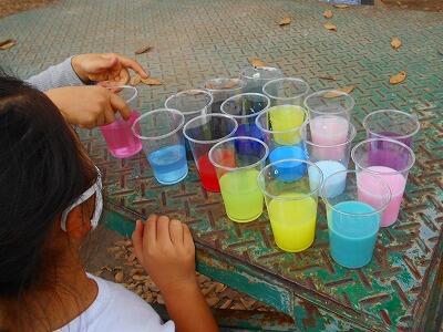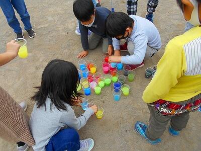 図工の学習で、絵の具を使って色水を作りをしていました。