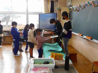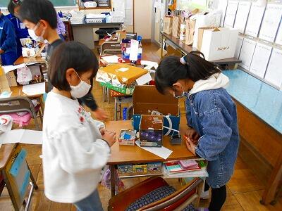 最初にプレゼント交換をしました。2年生は松ぼっくりで作ったミニツリー、1年生は折り紙の作品をプレゼントしました。